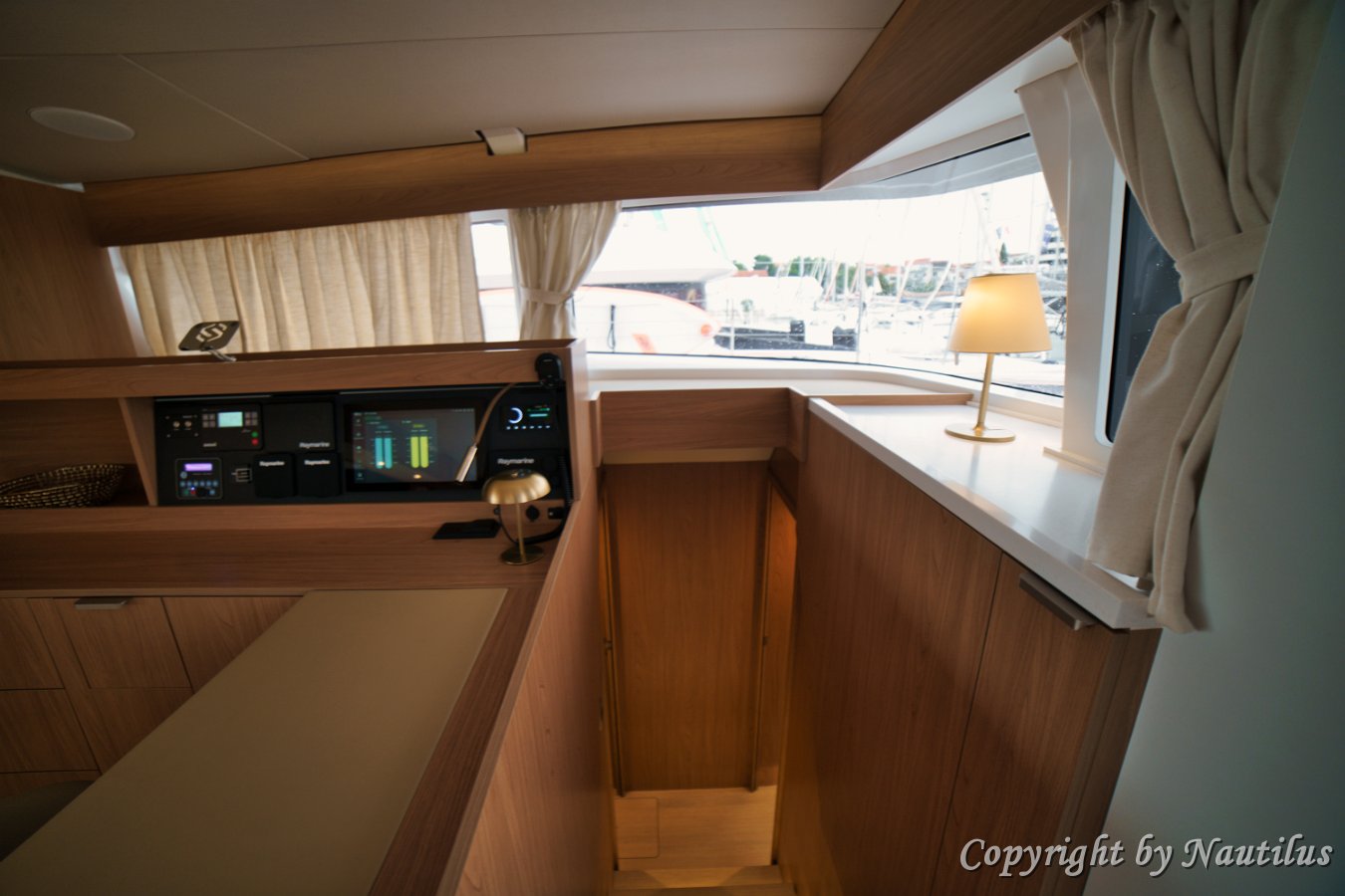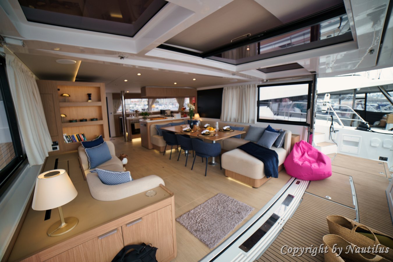 Bali-58-Fly-Salone Concetto Bali Open Space Interni di lusso Vista panoramica dal salone Zona pranzo Lounge relax Cucina Gourmet Bali 5.8 Design della cucina Frigorifero americano Tavolo da carteggio Timoneria interna Accesso alle cabine Cucinare a bordo Cucina Open Space Atmosfera serale Isola centrale Finestra anteriore Visione passante Design d'interni