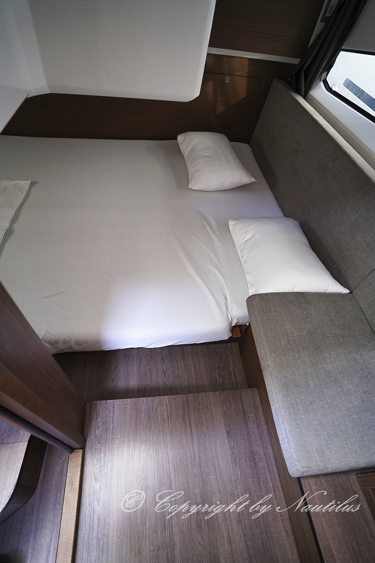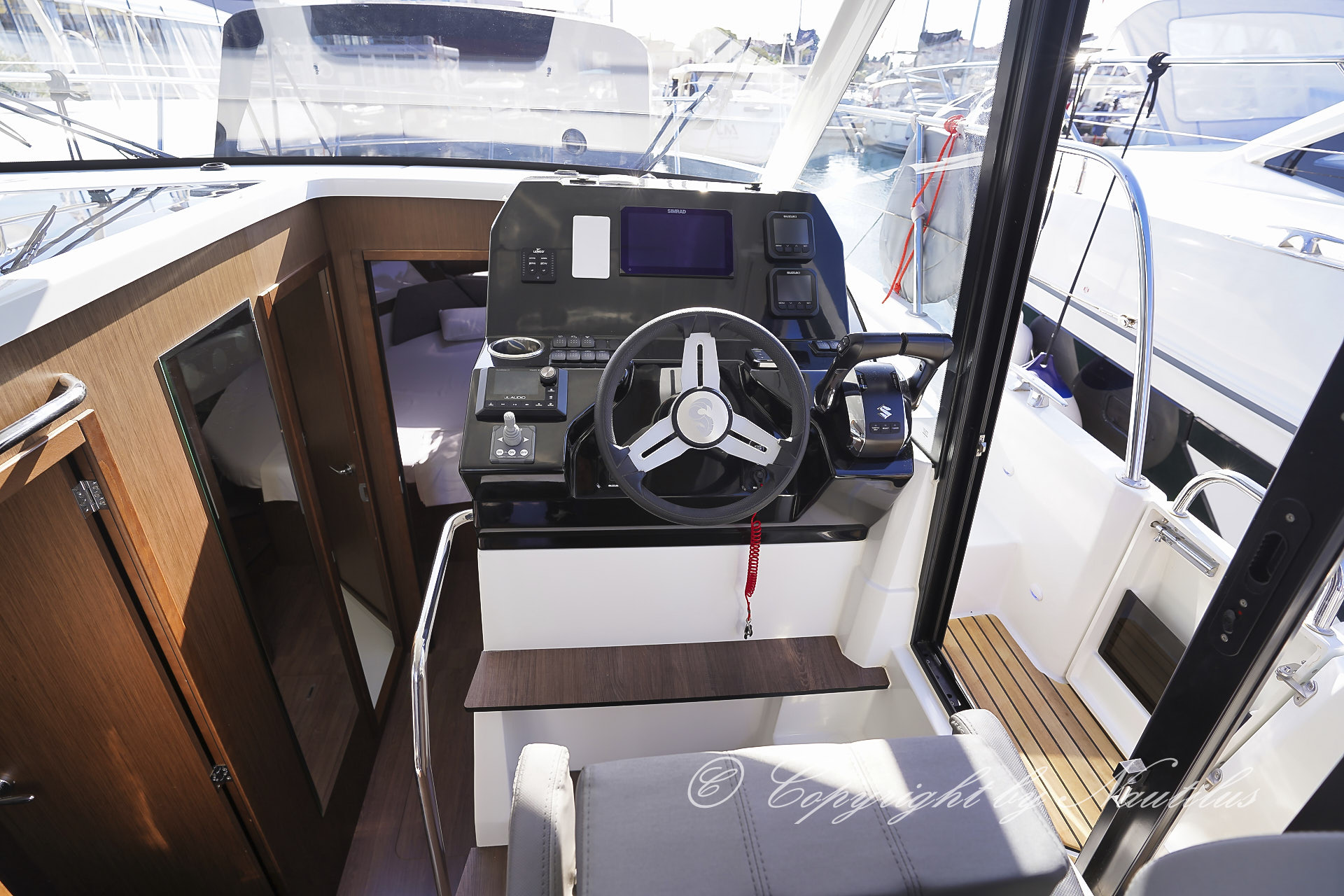 Antares 11 Fly, INNENDESIGN: Helligkeit und Bordkomfort machen diesen großen Weekender aus. Die doppelte Eignerkabine mit direkt angeschlossenem Bad hebt sich vom üblichen Standard ab. Die hintere Kabine bietet drei Schlafplätze und erstreckt sich über die gesamte Breite des Schiffs. Der wandelbare Salon der Antares 11 bietet komfortabel bis zu 6 Personen Platz. Die großen Fenster des Steuerhauses ermöglichen einen fantastischen Panoramablick.