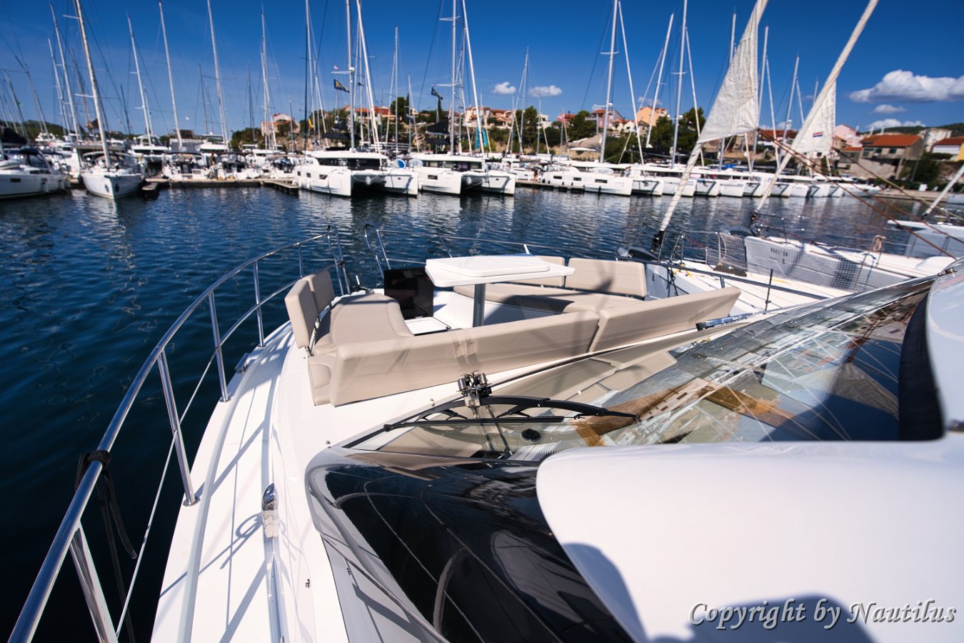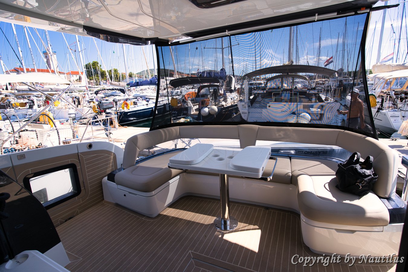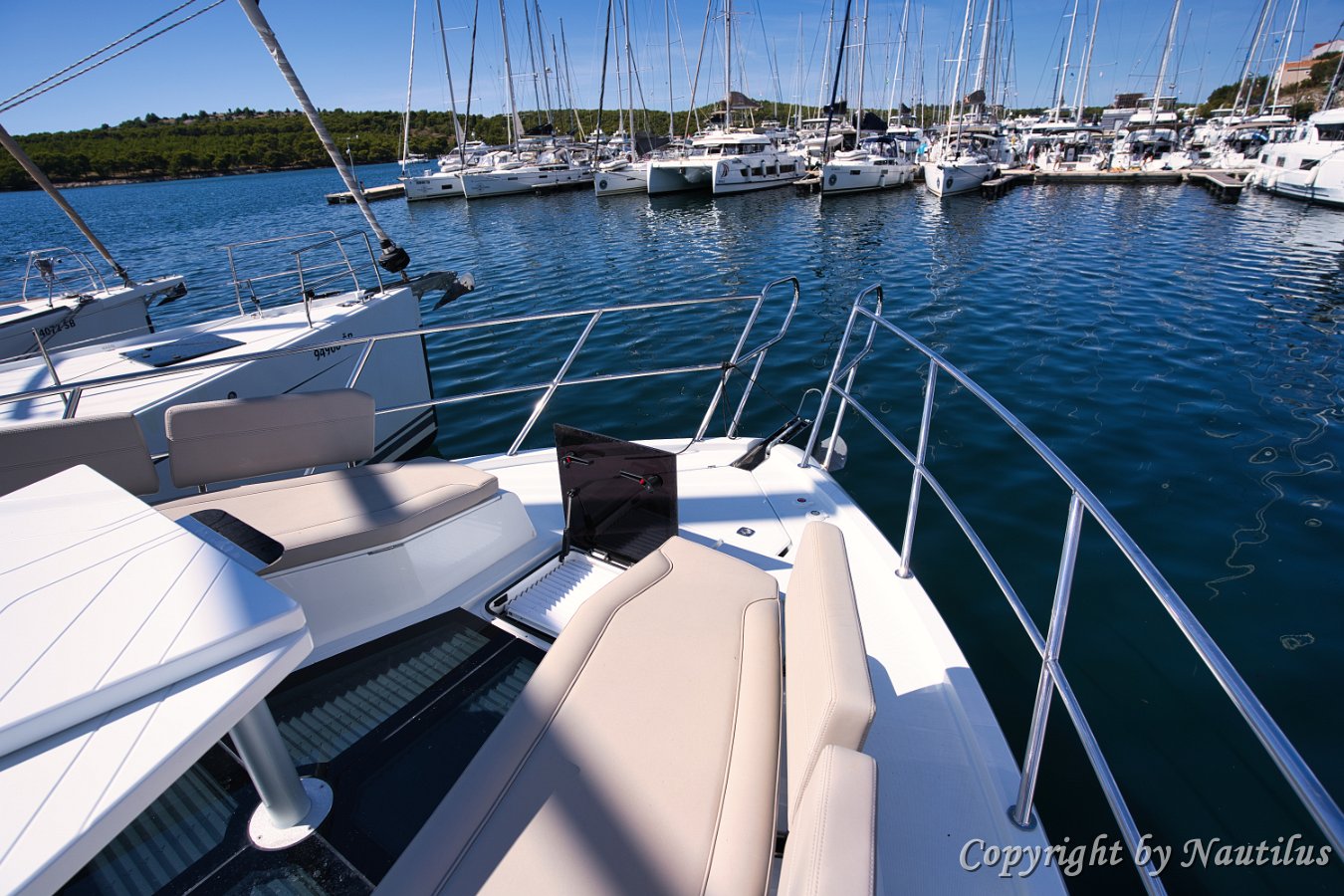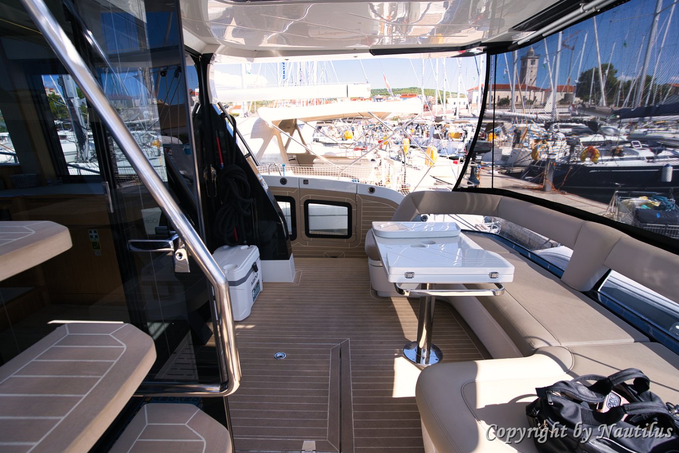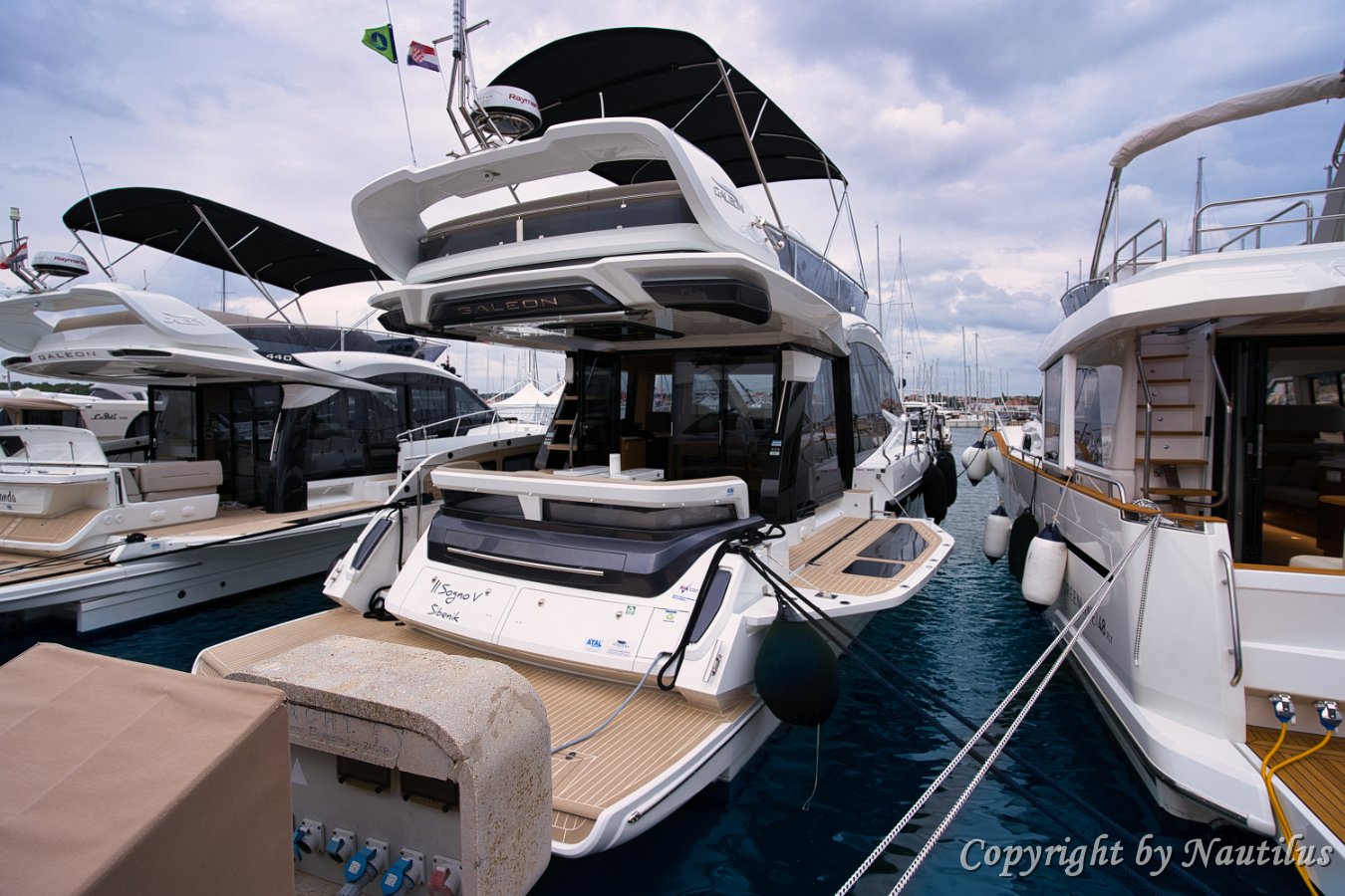 Galeon-480-Fly-Deck Badeplattform Essen im Freien Beschattetes Cockpit Saloneingang Sonnenliege am Bug Profil der Il Sogno V Design-Details Modernes Exterieur Blick vom Vordeck Galeon 480 Fly Außen-Wetbar Geräumiges Vordeck Seitendeck Bug-Lounge Verstellbare Sonnenpolster Teakdeck Heckbereich Bereit für den Charter