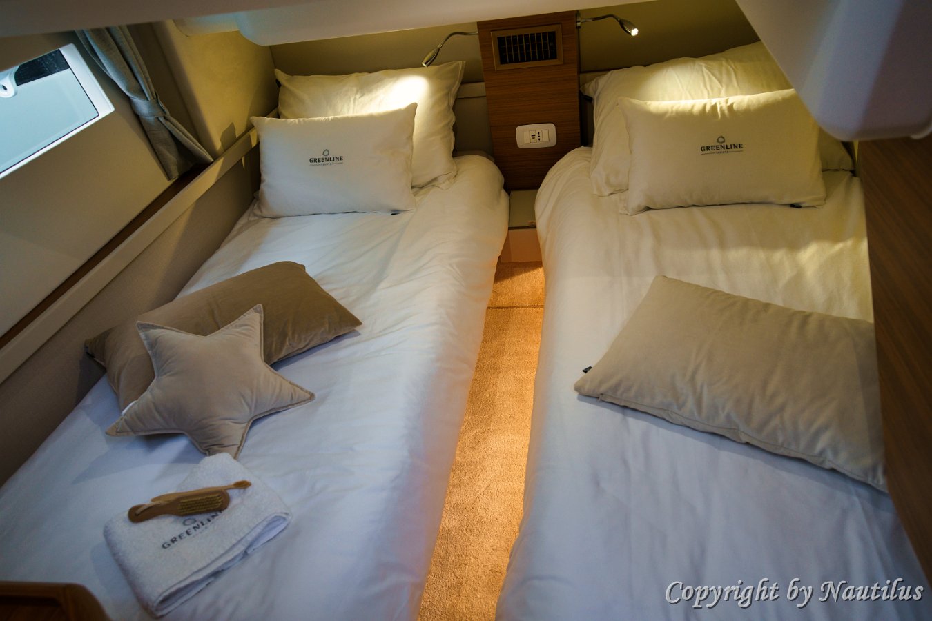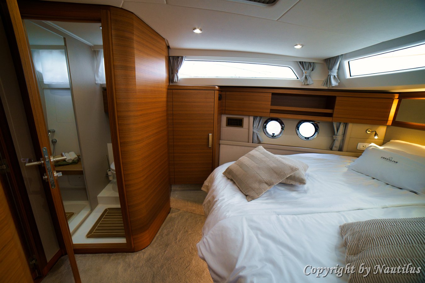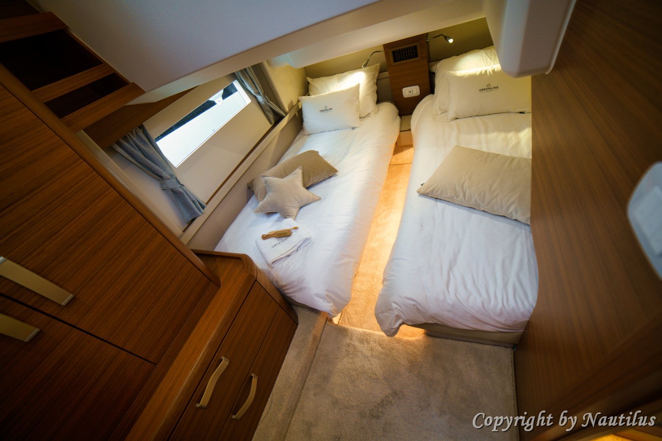 Greenline-48-Fly-Kabine Greenline 48 Eignerkabine Komfort des Eigners Natürliches Licht Stauraum in der Eignersuite En-suite Badezimmer Interieur der Red Hot Korridor Unterdeck Steuerbord-Gästekabine Gästekomfort Zweibett-Layout Kabineneingang Backbord-Gästekabine Greenline Unterkunft Einzelbetten